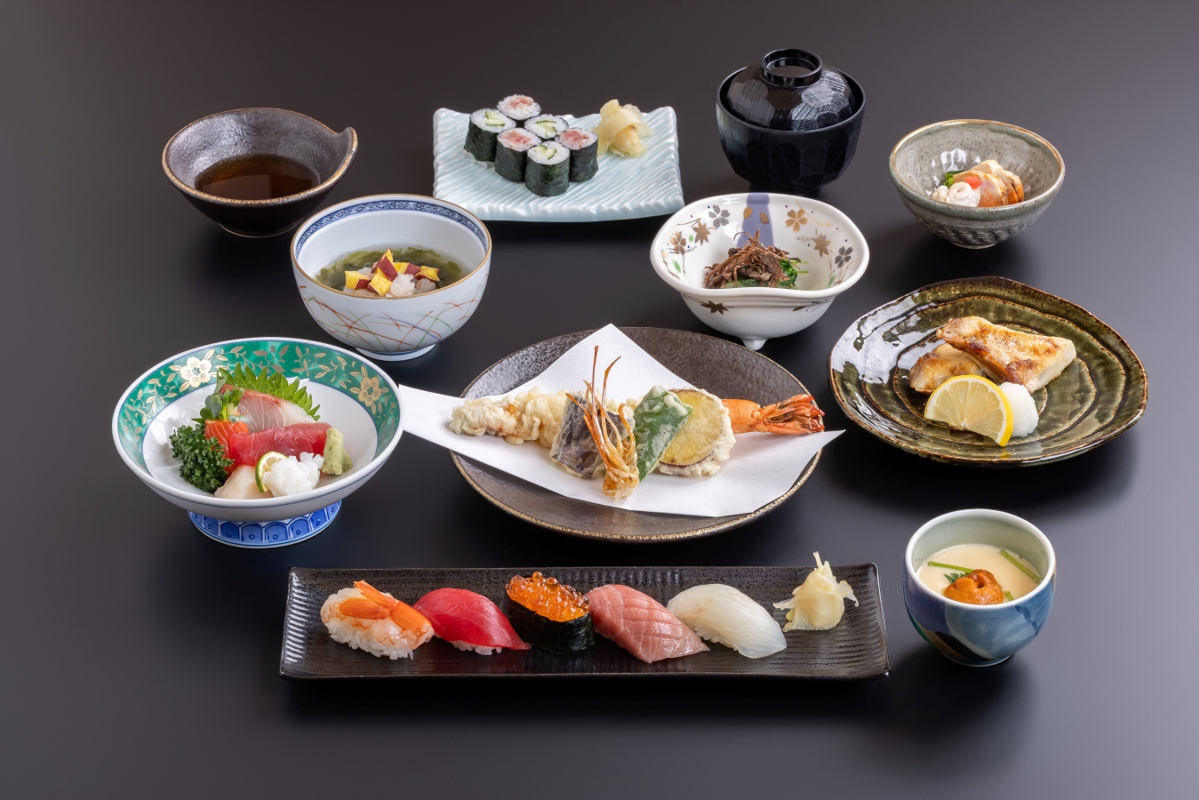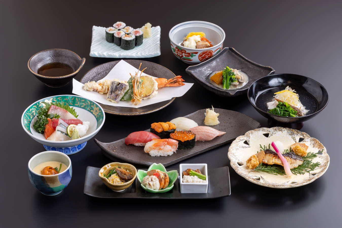 特上寿司6貫、旬の先付3点盛、椀物、刺身、細巻、茶碗蒸し、焼物、季節の小鉢、大えび入り天ぷら、温物