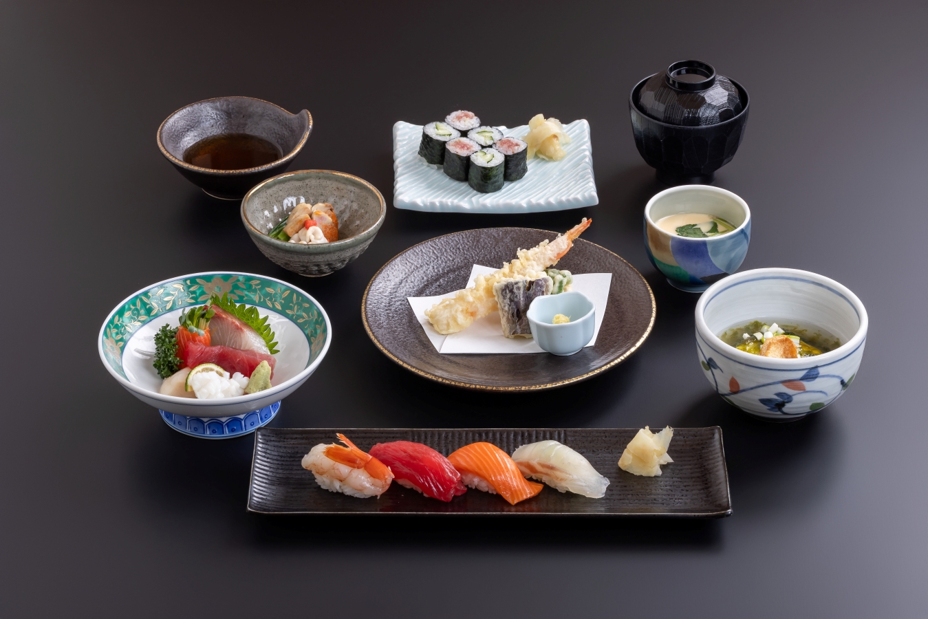 寿司4貫、旬の先付、刺身、細巻、茶碗蒸し、天ぷら、温物、味噌汁